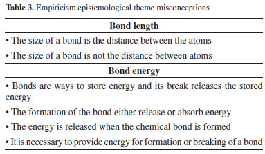 In "polarity," misconceptions continues to present the bonds as a property of another concept, but now with the polar or nonpolar behavior also as if it was defined by atoms or molecules itself. For instance, it excludes any contribution of environment or changes in the polarity of the same compound. Another common conception is the explanation of a covalent bond simply as a type of bond stronger or weaker than other bonds with no more details.33-35 All these groups of conceptions were proposed by us according to those ones shown in Table 2. They all share an absence of good explanation over bonds or covalent bond, they imply a second concept with no context at all. In addition, some ideas seem too general for a scientific concept, just like "force," that describes the bond as an abstract phenomenon, or "structure" using it as a solid that holds atoms together, including all changes at the macroscopic level as happening directly in covalent bonds. Some conceptualizations for the formation of bonds between atoms, especially the classificatory ones, can also be found in the theory of radicals and types, starting in the middle of XIX century.20,36 At that time, there was no concern in detailing or describing the bonds itself, only the classification of reactivity according to the atoms, by elements of periodic table. The result of epistemological analysis8 from that time (e.g., classification methods) and the development of the concept in the subject history shows an attempt to understand the bond as something to be classified in one or another group, covalent or ionic, metal or nonmetal, even though no parallel for this exact classification can be found in epistemological foundations. For example, it seems to have no scientific basement showing a direct connection between the periodic table labelling and the typification of bond present in the connectivity between atoms. These missing points of the identified misconceptions made us classified them as Realism because it shows the start of a conception network, but it is made with little or no foundation at all in chemical and physical sciences. The third epistemological theme, called Empiricism, is the group of misconceptions related to empirical data. For instance, the size of bonds or its energies, usually found in textbooks in table format. As we show in Table 3, some of the reported studies show the association made by secondary students and secondary science teachers, between the concept of covalent bonds and a value obtained experimentally.37,38 This concept is also common in several other articles that define the covalent bond as a range of the amount of energy or size. As expected, it can directly influence the teaching process and appears in different grades of teaching and learning.39,40 We also observed the misconception about how these tabulated data are obtained, how bond length is determinate, since students end up arbitrarily using the process of forming or breaking the covalent bond, mixing them with energy absorption or release. Both students and teachers need to be aware of how these data are obtained and what the tabulated number represents, as average numbers and the specific conditions.