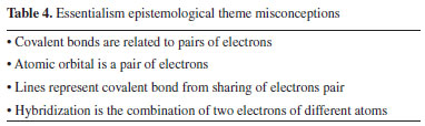 The Essentialism theme was identified from some definitions of covalent bonds as exclusively composed of electrons in pairs between atoms, as a simplistic attribution of an essential characteristic: all bonds are covalent if present a pair of shared electrons, as can be seen in Erman's41 study. Besides, it is a widespread idea. From the seminal works of Lewis19,42 and Langmuir,43 it can hinder further analysis or more complex systems. For instance, Salah and Dumon's44 study shows the physical sciences higher students' conception of covalent bond as electrons shared in pairs poorly related to theories of atomic orbitals or even hybridization. Once more, both conceptions have no direct parallel in epistemological foundations. According to Table 4, other sentences include an association between the line's representation and evenly shared electrons, which is like the ones identified in Realism, but now resonating with the Lewis structure.45,46