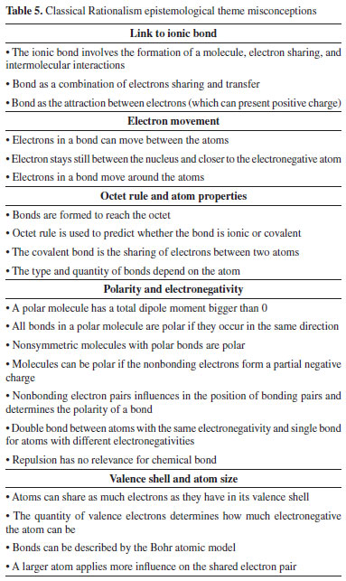 The conceptions classified as Classical Rationalism show close similarity with the previous theme because they were also influenced by Lewis and Langmuir's contributions but not limited to the covalent bond as electrons shared in pairs. In fact, the sentences reproduce the idea of a concept no longer isolated, but dependent of a closely related network of concepts.47-49 The reported conceptions encompass the covalent bond present in every system of atoms, as the only possible connection between them, instead of a connection occurring in a specific way. In the ionic bonds, for instance, as can be seen in Table 5, the covalence is a step to achieve the ionic compound, which can be related to the formation of a long-range chain, according to elementary school students.40,50,51 The process, according to elementary and undergraduate students of biology, include the formation of covalent bonds between sodium and chlorine, for instance, followed by intermolecular forces, and finally the whole progression would be called ionic.33,52 Generally, the sentences show closer connections between the conceptions and perform them more coherently. Also, we verified misconceptions concerning the movement of electrons by the molecule, the octet rule once more (as a property of each atom), the consequences of the covalent bond on the molecular polarity, and the misrelation with Bohr's atom model (of size and valence shell).46,53,54 The sentences related to electron movement show the difficulty of the students to interpret the behavior of electrons in a molecule, as these electrons could only be between the atoms or if they move in orbits, such as in Bohr's atomic model. Polarity related misconceptions show ideas attributing the behavior (of being or not polar) to the covalent bond as generic rules, and not as dependent of different properties and molecular environment. Some sentences show the bond as a property of atoms that controls it, or as a property of electrons to bind (besides equal charge repulsion) seeking to complete the octet.55-57