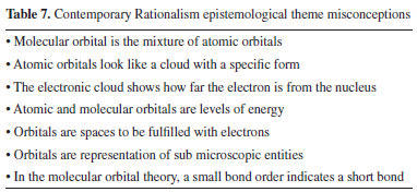 CONCLUSIONS Our review of misconceptions reported in literature shows a panoramic view of the topic, how it has been conducted through the years, the similarity between different articles, recent research about the topic, and how they can be classified in epistemological themes. Nevertheless, we considered all the epistemological themes previously suggested, what indicates that much is known about the misconceptions concerning the theme. Besides, this article was about a different proposal to organize empirical data on misconceptions with a panoramic and analytic view. It was not necessary to create new epistemological themes during the process, once all the sentences were associated with some theme. According to this work, all themes present significant meanings related to some model or theory, showing that it is possible to misinterpret all of them. However, not all themes found the same quantity of papers, as for the Contemporary Rationalism, indicating possible gaps in the topics, different publics, or different levels of education. In conclusion, for the covalent bond and related topics, we discussed how a concept can be extremely complex considering all established connections, also how the themes can be organized and planned for a more effective teaching on chemical bonds. Although it is possible that some topic was excluded, the themes from Animism to Contemporary Rationalism contemplates several conceptualizations and certainly a class about the covalent bond will cover, at least, a part of what was discussed here, showing the extension of this study. Once professors or teachers recognize the problematic of using such ideas as animistic feelings, or the concrete existence of orbitals, for example, they can warn students that these conceptions are simply an analogy, or a metaphor, that may work "for now," as a scaffolding strategy, but these ideas need deeper understanding and planned actions as an example of how the information can be used. While for the general theme of misconceptions, it was possible to access how studies have reported the content. It includes, for example, different authors for different publics getting to similar statements over the same topic. For future research, our review may be used as a starting point for discussing the mistakes on these misconceptions, according to scientific reports, thinking on class context and in the conceptualization process by the students, as well as for planning and assessing teaching-learning sequences about covalent bonding. SUPPLEMENTARY MATERIAL The full material with all conceptions found by this article is available at http://quimicanova.sbq.org.br, in PDF format, with full access.
