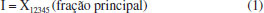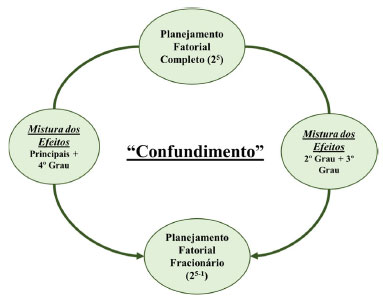 Nos planejamentos completos são avaliadas as respostas de todos os efeitos (principais e interações). Nos planejamentos saturados ou Plackett-Burman são avaliadas as respostas somente dos efeitos principais e no planejamento fatorial fracionário é estimado somente os efeitos (contrastes) que apresentam a possibilidade de influenciar na resposta.15 A Matriz X do planejamento é o conjunto de sinais algébricos que identificam o nível de cada variável e todas as combinações de interações possíveis para o cálculo de todos os efeitos.5,15 No planejamento fatorial fracionário 25-1 os efeitos das interações de terceira (Xijk) e quarta (Xijkl) ordem não aparecem na Matriz X, visto que estes efeitos de maiores ordens são confundidos com outros efeitos principais e de 2ª ordem. Dessa forma, os efeitos das interações de 4ª ordem (X1234 X1235 X1245 X1345 X2345) são misturados com os efeitos principais (X5, X4, X3, X2 e X1), respectivamente. Já os efeitos de 2ª ordem (X12; X13; X14; X15; X23; X24; X25; X34; X35; X45;) são misturados com os efeitos de 3ª ordem (X345; X245; X235; X234; X145; X135; X134; X125; X124; X123), respectivamente. A Figura 2 apresenta as misturas (chamados também de confundimentos) dos efeitos num planejamento fatorial fracionário 25-1.