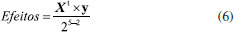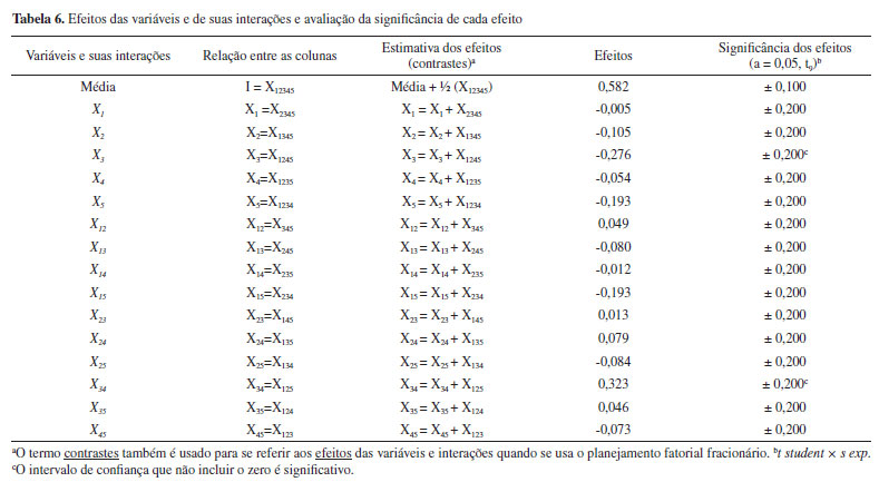 A linearidade da curva analítica da cafeína foi expressa usando o coeficiente de determinação (r2 = 0,990), indicando uma ótima relação linear (r2 próximo a 1). No entanto, para validação de procedimentos analíticos é recomendado que a linearidade seja avaliada por métodos estatísticos de análise de variância (ANOVA).27 O Teste F foi aplicado para verificar a significância da regressão, uma vez que um Fcalculado maior que o Ftabelado indica uma regressão linear adequada e, consequentemente, um modelo matemático que represente satisfatoriamente o experimento. O modelo apresenta um Fcalculado (833) maior que o F1,10 (tabelado) (4,97) indicando uma regressão linear ideal. Além disso, o modelo apresentou um Fcalculado (5) próximo ao F4,6 (tabelado) (4,53), indicando que não há evidência de grande falta de ajuste no modelo. Desse modo, pode se considerar, com 95% de confiança, que a curva analítica está significantemente correta e bem ajustada para a quantificação da cafeína e que a hipótese da linearidade não pode ser descartada para a curva analítica construída (ou seja, a hipótese nula não pode ser rejeitada). Avaliação das variáveis usadas no planejamento fatorial fracionário 25-1 A partir do planejamento fatorial fracionário de resolução V (25-1) foi realizada uma avaliação das cinco variáveis usadas para a extração de cafeína usando a máquina de café expresso. O planejamento fatorial fracionário executado neste trabalho e as concentrações de cafeína (% m/m) extraídas na máquina de café expresso são apresentados na Tabela 5. A Tabela 5 foi construída com base na Matriz X do planejamento fracionário 25-1 (Tabela 1) e apresenta as cinco variáveis e os dois níveis estudados, gerando 16 experimentos. A partir das respostas (concentração de cafeína % m/m) geradas no planejamento fatorial fracionário foram calculados todos os efeitos e sua significância. Vale destacar que a extração líquido-líquido da cafeína dos cafés moídos empregando o diclorometano como solvente extrator, apresenta uma eficiência de extração de 98 - 99 % de acordo com a literatura.24,28-30 Além disso, de acordo com a Resolução CNNPA nº12/1978, os cafés devem conter pelo menos 0,7% m/m de cafeína.31 Em todos os experimentos realizados obteve-se um teor de cafeína maior que 0,7% m/m. Vale destacar que o teor de cafeína obtido em todos os ensaios está em conformidade aos encontrados na literatura.32-35 Cálculo dos efeitos Para o cálculo dos efeitos de cada variável e dos efeitos das suas interações foi necessário transpor a Matriz X (Tabela 1) e multiplicá-la pelo vetor y (respostas da concentração de cafeína apresentadas na Tabela 5). Após isso, a multiplicação (Xt ×y ) foi dividida pela metade do número de experimentos diferentes executados, obtendo os valores dos efeitos das variáveis e de suas interações (Eq. 6) (Tabela 6). Os efeitos se referem a diferença entre duas médias, a média do nível superior menos a média do nível inferior. Como a metade dos experimentos é realizada em cada nível, os valores dos efeitos são divididos pela metade do número de ensaios realizados. ![]()
