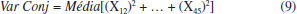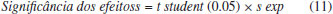 O efeito da média é obtido dividindo a multiplicação (Xt × Y) pelo número total de experimentos, obtendo assim o efeito global médio (Eq. 7). ![]() A seguir, será calculado o efeito da variável temperatura usando o Excel para demonstrar como é feito. A planilha eletrônica do Google (Google sheets) também pode ser usada para cálculo dos efeitos. Passo 1: Transpor a Matriz X É necessário que seja construída a Matriz Xt que pode ser obtida copiando toda a Matriz X e, posteriormente, colando especial de forma transposta (T). Passo 2: Multiplicação (Xt × y) Na célula do Excel que desejar, coloque o sinal de igual e selecione a função matemática de multiplicação de matrizes (= MATRIZ.MULT). Em seguida, selecione as células que apresentem os códigos -1 e +1 e que correspondem à variável temperatura na matriz transposta (Xt). Passo 3: Cálculo do efeito Aperte a tecla ponto e vírgula (;) e selecione agora as células com todas as respostas do vetor y. Feche o parêntese e dividida por oito. O mesmo procedimento pode ser realizado para calcular os outros coeficientes de contraste. Vale destacar que para cálculo do contraste global médio, o valor final deve ser dividido por dezesseis. Cálculo da significância de cada efeito A estimativa da incerteza para cada efeito deve ser analisada com 95% de confiança por meio das interações dos efeitos de maior ordem (X12, X13, X14, X15, X23, X24, X25, X34, X35, X45), considerando um grau de liberdade para cada um desses efeitos, totalizando 10 graus de liberdade (t student = 2,228). Entretanto, o efeito X34 apresentou um valor bem alto se comparado aos demais efeitos das interações (Tabela 6). Dessa forma, a estimativa da incerteza foi calculada somente com as 9 interações dos efeitos de maior ordem (X12, X13, X14, X15, X23, X24, X25, X35, X45), considerando um grau de liberdade para cada um desses efeitos, totalizando 9 graus de liberdade (t student = 2,262). A significância dos efeitos foi calculada a partir da multiplicação do t student, 2,262 (95 % de confiança) pela estimativa do erro padrão do efeito (Tabela 6). A seguir, será apresentado os passos para calcular a estimativa da incerteza dos efeitos das variáveis. Passo 1: Elevar ao quadrado todos os efeitos das interações, isso é, obter a variância de cada efeito (Eq. 8). ![]() em que ij são os números referentes as interações X12, X13, X14, X15, X23, X24, X25, X35, X45. Passo 2: Obter a média de todos os efeitos elevados ao quadrado para estimar a variância conjunta (Eq. 9). ![]() Passo 3: Obter a estimativa do erro padrão do efeito (Eq. 10). ![]() Passo 4: Obter a significância dos efeitos (estimativa da incerteza dos efeitos) a partir da multiplicação do t student, 2,262 (95 % de confiança, 9 graus de liberdade) pela estimativa do erro padrão do efeito (Eq. 11). ![]() Avaliação dos efeitos pelo gráfico de pareto Espera-se que as interações dos efeitos de maior ordem sejam não significativas (exceto o X34), visto que eles foram usados para calcular a significância dos efeitos. A Figura 5 apresenta os efeitos significativos das variáveis estudadas. Observa-se que somente a variável X3 (granulação) e a interação da variável X3 com a variável X4 (ou seja, X34) foram significativas.