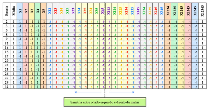 A Figura 2 foi apresentada somente com o intuito de demonstrar que no planejamento 25-1 há o confundimento dos efeitos. Entretanto, essa não é a matriz usada para construir o planejamento fatorial fracionário 25-1, conforme será mencionado mais adiante. Os sinais das colunas do lado esquerdo da matriz são os mesmos que os do lado direito e, por isso, dizemos que o efeito referente a cada uma dessas variáveis ou interações estão confundidos. Para facilitar a visualização das colunas da matriz correspondentes aos efeitos confundidos foram coloridas com as mesmas cores. Dessa forma, pode-se afirmar que o efeito da interação de 4ª ordem (X1234) está misturado com o efeito principal (X5), por exemplo. A Figura 1S (Material suplementar) apresenta as informações que foram usadas para chegar na matriz simétrica (Figura 2) do planejamento fatorial fracionário 25-1. Uma maneira simples de obter os efeitos que estão confundidos no planejamento fatorial fracionário é usar a relação geradora I (coluna representada por todos os sinais +1, ou seja, a média - Figura 2) e a partir dela obter os efeitos que são confundidos (Eq. 1). ![]() Multiplicando ambos os lados da Eq. 1 por X1, tem-se (Eq. 2). ![]() Quando multiplicamos duas colunas iguais o resultado será sempre um vetor unitário, assim, podemos eliminá-lo da equação (Eq. 3). ![]() Portanto, o efeito da variável X1 está misturado (confundido) com o efeito da interação X2345 (efeitos que estão confundidos são chamados de pares associados, ou aliases). No entanto, por uma questão hierárquica, é muito mais comum que efeitos principais sejam mais importantes do que os de ordens mais altas. Assim, ao assumir que os efeitos de ordens mais altas têm pouco ou nenhuma significância, então pode-se concluir que um efeito grande de X1 seja exclusivamente desse efeito principal. Como construir uma matriz de um planejamento fatorial fracionário? O resultado da mistura desses efeitos principais ou interações com efeitos de maiores ordens gera a matriz do planejamento fracionário 25-1 (Tabela 1). Dessa forma, a construção da Matriz X do planejamento fatorial fracionário (25-1) é realizada seguindo os seguintes passos:
