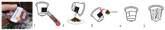 ![]() Figura 3. Procedimento de preparo das cápsulas com as amostras de café: 1: abertura da cápsula com estilete; 2: a cápsula foi esvaziada e limpa; 3: a amostra do café foi adicionada à cápsula limpa; 4: fechamento da cápsula com cola e fita adesiva; 5: cápsula envolta em papel alumínio