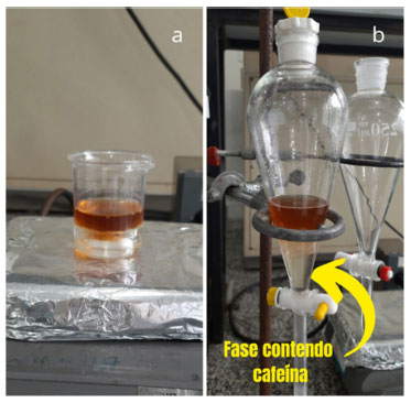 ![]() Figura 4. (a) Extrato em agitação magnética durante a extração líquido-líquido da cafeína; (b) separação das fases
