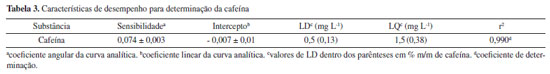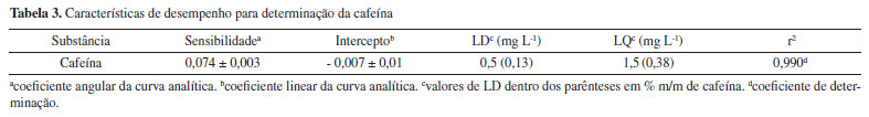 RESULTADOS E DISCUSSÃO Avaliação do desempenho analítico para determinação da cafeína A Tabela 3 apresenta os parâmetros de desempenho alcançados para a determinação da cafeína nas amostras de café por espectrofotometria UV-Vis.