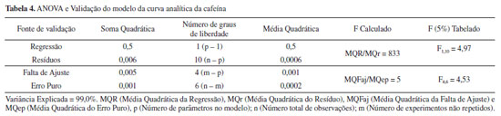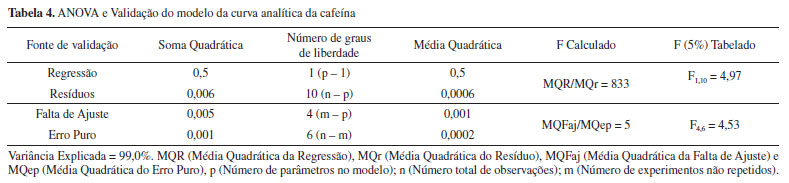 Os teores de cafeína nos 16 experimentos (Tabela 5) apresentaram-se maiores que o LQ para a cafeína, indicando que a determinação da cafeína nas amostras de café foi realizada com precisão e exatidão aceitáveis. Além disso, foi empregada a análise da variância (ANOVA) para avaliar a regressão e falta de ajuste da curva analítica (Tabela 4).