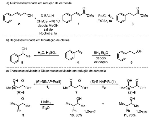 ![]() Esquema 2. Exemplos de: (a) Quimiosseletividade; (b) Regiosseletividade; (c) Enantiosseletividade e Diastereosseletividade