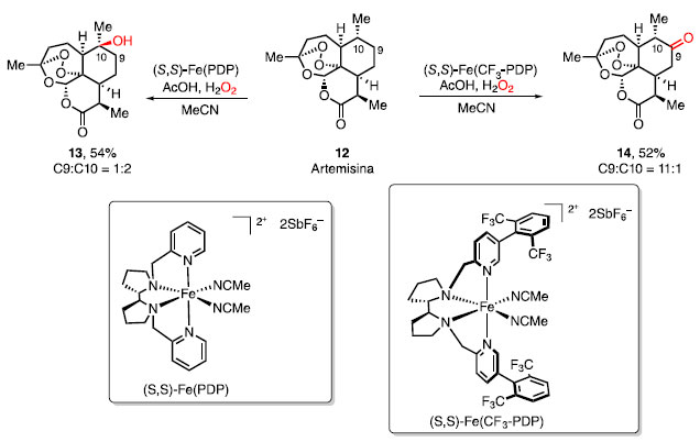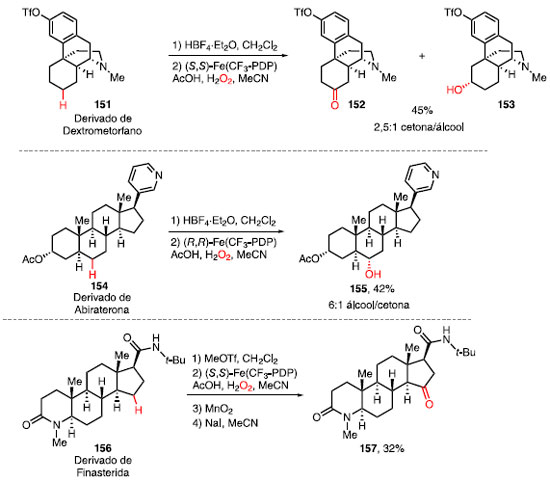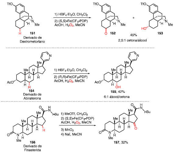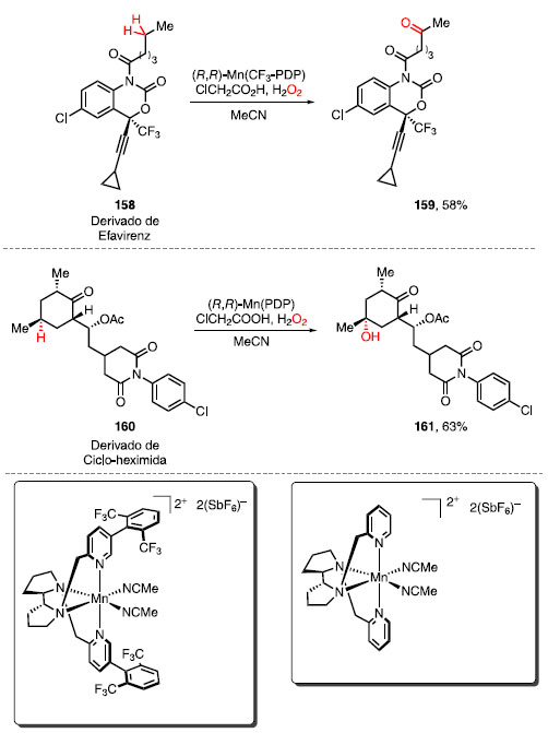 O derivado da abiraterona (154), um fármaco recentemente aprovado pela Agência Europeia de Medicamentos (da sigla EMA) para o tratamento de câncer de próstata, forneceu o álcool 155 em 42% de rendimento como único diastereoisômero após o tratamento com HBF4 seguido da oxidação com (R,R)-Fe(CF3-PDP). O derivado de finasterida (156), utilizado para prevenir a queda de cabelo e no tratamento de hiperplasia protástica benigna e câncer de próstata, foi convertido na cetona 157 em 32% de rendimento após o tratamento com MeOTf seguido da oxidação com (S,S)-Fe(CF3-PDP). Para moléculas contendo anéis aromáticos, uma estratégia complementar foi desenvolvida. Em 2019 e 2020, White e colaboradores reportaram o uso dos catalisadores de manganês Mn(CF3-PDP) e Mn(PDP) e ácido cloroacético como aditivo para a oxidação quimiosseletiva de ligações C-H de metilenos e metinos, respectivamente.52 O derivado de efavirenz (158), um fármaco utilizado para inibir o vírus HIV da AIDS, forneceu a metilcetona 159 em 58% de rendimento utilizando o sistema Mn(CF3-PDP)/ácido cloroacético. A oxidação do análogo da ciclo-heximida (160), um antibiótico utilizado para inibir a atividade de mofos, leveduras e fungos, com Mn(PDP) levou à formação do álcool 161 em 63% de rendimento (Esquema 32).