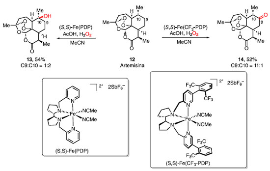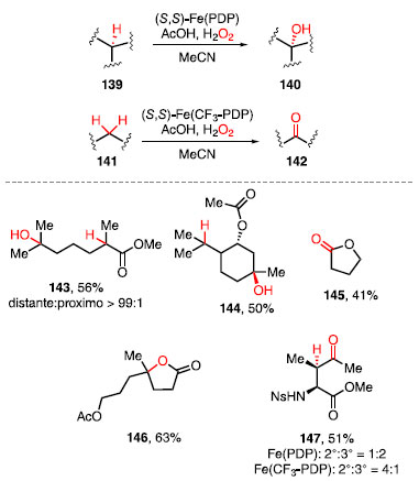 Entre 2007 e 2013, White e colaboradores desenvolveram os catalisadores não-heme Fe(PDP) e Fe(CF3-PDP) e métodos de oxidação de ligação C-H com o uso de peróxido de hidrogênio como oxidante, ácido acético como aditivo e acetonitrila como solvente foram reportados (Esquema 29).10,48 Nessas reações não há a necessidade de cuidado com oxigênio e umidade.