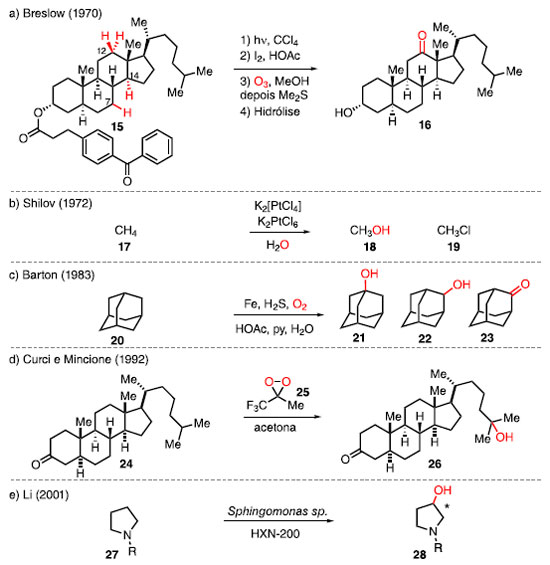 ![]() Esquema 4. Exemplos históricos de funcionalização C-H por: (a) Breslow; (b) Shilov; (c) Barton; (d) Curci e Mincione; (e) Li