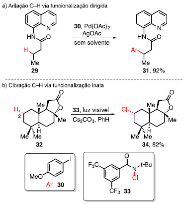 Em 1972, Shilov e colaboradores desenvolveram uma reação de ativação da ligação C-H de metano (17) mediada por complexo de platina, este que passa por intermediários de platina (IV), de alta valência, para obter a mistura de metanol (18) e cloreto de metila (19). Este exemplo se tornou o primeiro a utilizar complexos metálicos para a funcionalização de metano (Esquema 4b).13 Em 1983, Barton e colaboradores reportaram a oxidação C-H do adamantano (20) utilizando catálise de ferro, obtendo majoritariamente álcool secundário 22 e cetona 23 na frente do álcool terciário 21.14 Nos primeiros exemplos, foi empregado o uso de ferro metálico, sulfeto de hidrogênio, piridina e mistura de água e ácido acético, com o oxigênio molecular como fonte para a inserção de oxigênio na molécula. Esse tipo de reação ficou conhecida como reações de Gif, em homenagem à cidade de Gif-sur-Ivette, local onde os primeiros exemplos dessa reação foram realizados (Esquema 4c). Em 1992, Curci e colaboradores introduziram a oxidação do esteroide 24 utilizando trifluorometildioxirano (TFDO) 25, um dioxirano com alta reatividade, fornecendo o produto 26 (Esquema 4d).15 Esse reagente, além de oxidar a ligação C-H mais distante de um grupo retirador de elétrons, consegue realizar a funcionalização C-H de maneira concertada, sem que ocorra a formação de radical ou de carbocátion. Além disso, em 2001, Li e colaboradores utilizaram a catálise enzimática para hidroxilar derivados de pirrolidina 27 para o produto 28 (Esquema 4e).16 As células envolvidas, além da utilização após o crescimento, foram também utilizadas após meses de congelamento, sem que houvesse perda da atividade. Após os anos 2000, o número de estudos envolvendo reações de funcionalização de ligações C-H aumentou significativamente, trazendo com isso o desenvolvimento de novas metodologias sintéticas para a funcionalização quimiosseletiva dessas ligações.7,8 Esses avanços tiveram um grande impacto tanto na área de síntese total,17 quanto na área de funcionalização em estágio avançado, em que produtos naturais foram funcionalizados para obter derivados com melhor atividade biológica. Também foram reportadas derivatizações de candidatos de fármacos, diodos orgânicos emissores de luz (da sigla, OLEDs), estruturas metalorgânicas (da sigla, MOFs) e polímeros, mostrando o alcance que essa estratégia pode ter.3,7,8,18 No geral, existem duas estratégias na lógica de funcionalização C-H para favorecer a formação de um produto de forma seletiva: a "dirigida" e a "inata".19 A funcionalização C-H dirigida utiliza um segundo grupo funcional na molécula, o qual é chamado de grupo diretor ou grupo dirigente, para coordenar a um complexo metálico, e direcionar reatividade a uma ligação C-H mais próxima. Um exemplo deste tipo de funcionalização é o uso da 8-amino quinolina como grupo diretor para a arilação C-H, introduzida por Daugulis e colaboradores. No exemplo, é utilizado o substrato 29 que, na presença do iodeto de arila 30, Pd(OAc)2 e AgOAc, sofre a reação de arilação para fornecer o produto 31 (Esquema 5a).19,20,21