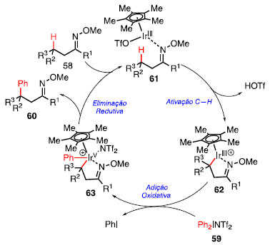 O aumento do volume estéreo causado pelos grupos adjacentes reduz gradualmente o rendimento, como observado em 60a-60c. Há seletividade para a funcionalização de ligações C-H na posição b primárias frente a secundárias, como observado na formação exclusiva de 60d. Substratos com hidrogênios na posição a se mostraram compatíveis com a metodologia, assim como composto cíclico 60e. Piridinas podem atuar como grupos dirigentes além de éteres de oxima, sendo capazes de fornecer produtos monoarilados com excelentes rendimentos, como visto em 60f. Após estudos computacionais, o mecanismo reacional proposto inicia-se com a coordenação da oxima 58 ao catalisador de irídio levando à formação do intermediário 61 (Esquema 9). Com o auxílio da base, a abstração do hidrogênio na posição b, formando o metalaciclo 62, ocorre via metalação-desprotonação concertada (da sigla em inglês, CMD), liberando ácido tríflico. Em seguida, a adição oxidativa do sal de diaril iodônio 59 no intermediário 62, na qual o átomo de irídio passa do estado de oxidação III para V, fornece o intermediário 63. Por fim, após uma etapa de eliminação redutiva, a oxima 60 é liberada e o ciclo catalítico é restaurado.31