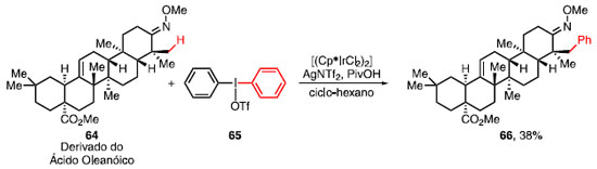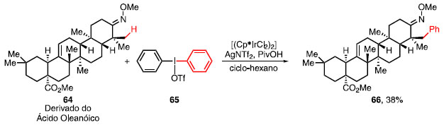 Neste ciclo catalítico, é importante ressaltar que há a formação in situ de 59, com NTf2 como base, tornando o processo da adição oxidativa mais favorável, quando comparada com o sal de diariliodônio contendo o OTf como base. Esta metodologia foi aplicada na arilação em b de um derivado do ácido oleanóico 64, um triterpeno não tóxico encontrado nas plantas da espécie Phytolacca americana, conhecido por apresentar propriedades antivirais e antitumorais.32 Ao utilizar o sal de diaril iodônio simétrico 65, AgNTf2, PivOH e [(Cp*IrCl2)2] obteve-se unicamente o diasteroisômero 66 em 38% de rendimento (Esquema 10).31