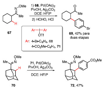 Uma estratégia semelhante foi explorada por Chen e colaboradores, ao realizarem a arilação em b de éteres de oxima com o auxílio de sais de diaril iodônio simétricos, utilizando Pd(OAc)2 como catalisador.33 Em relação ao trabalho do Xia, Shi e colaboradores, que utilizava catalisador de irídio, a metodologia desenvolvida pelo grupo de pesquisa de Chen utilizou catalisador de paládio, mais barato do que o correspondente acima, e pôde funcionalizar ligações C-H de metilenos, expandindo o escopo da reação desenvolvida. Para a oxima 67, a arilação utilizando o sal de diaril iodônio 68, catalisador de paládio, seguida da hidrólise ácida, forneceu a cetona 69 arilada na posição b em 42% de rendimento para duas etapas. Para a oxima 70, que contém o substituinte adamantano, a arilação nas mesmas condições reacionais, e com o sal de diaril iodônio 71, produziu a oxima 72 arilada em 47% de rendimento (Esquema 11).