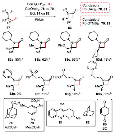 Em 2016, Gaunt e colaboradores desenvolveram uma metodologia de carbonilação C-H de aminas alifáticas 77 em posição b catalisadas por paládio para obter b-lactamas 83 (Esquema 13).36 Para isso, além dos catalisadores de paládio (II), foram utilizados o gás CO para a carbonilação, ácido adamantano-1-carboxílico (AdCO2H, 78) ou ácido 2,4,6-trimetilbenzóico (MesCO2H; 79) como ácidos impedidos estericamente para o ataque da amina ao paládio durante o ciclo catalítico.