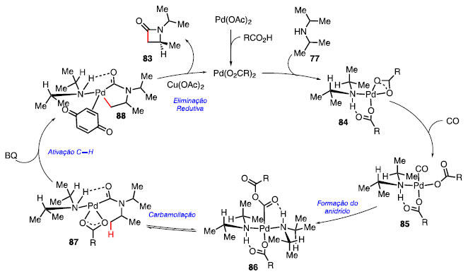 O acréscimo da benzoquinona (80) facilita a etapa de eliminação redutiva, enquanto o uso de ligantes nitrogenados, sendo uma quinolina 81 ou quinuclidina 82, permitiu que o catalisador e outros aditivos pudessem ser utilizados em uma menor quantidade. Por fim, o Cu(OAc)2 oxida o paládio, regenerando o ciclo catalítico. O aumento do volume estéreo observado em 83a-83d resulta em um menor rendimento da reação; a reação com a fenil isopropilamina 83e não teve sucesso nessas condições reacionais, por conta do efeito de ressonância entre o nitrogênio e o anel aromático nesse tipo de substrato. Uma variedade de grupos funcionais se mostrou tolerante como, por exemplo, a sulfona 83f, éster 83g e a pirimidina 83h.36 O mecanismo de reação proposto inicia-se com a troca de ligantes do pré-catalisador Pd(OAc)2 para o catalisador Pd(O2CR)2 (Esquema 14). Após coordenação da amina alifática 77 ao átomo de paládio, fornecendo o intermediário 84, ocorre a coordenação de CO para gerar o intermediário 85, com a formação do anidrido 86.