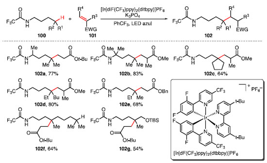 A presença do grupo trifluoroacetamida como grupo diretor facilita a transferência 1,5 do átomo de hidrogênio (1,5-HAT). Estudos revelaram que a reação ocorre em substratos que possuem substituintes a ao nitrogênio, fornecendo o produto 102a em bom rendimento. A variação do ambiente estéreo dos grupos substituintes ao redor da ligação C-H inerte tem pouca influência no rendimento das reações, fornecendo 102b-102e em rendimentos de moderados a bons. Há uma preferência para a funcionalização da ligação C-H através do 1,5-HAT frente a 1,6-HAT ou outra C-H terciária, como visto em 102f e 102g. O ciclo fotocatalítico proposto para essa reação consiste na irradiação de luz azul sobre o complexo de irídio, que passa para o estado excitado Ir(III)* que, com auxílio de uma base, abstrai o próton da ligação N-H da amida 100, formando o radical 103, e o complexo Ir(II) com a base protonada [B-H]+ (Esquema 20). Esse processo de transferência de um elétron entre duas espécies (do inglês, single-electron transfer, SET), é uma etapa importante para a formação de intermediário contendo radical, e para reações que passam por mecanismos radicalares.