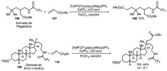 Após a formação do radical 103, ocorre a 1,5-HAT, fornecendo o intermediário radicalar 104, que realiza a adição conjugada com o alceno 101, via reação de Giese, gerando o intermediário 105. Esse intermediário, em conjunto com [B-H]+ e Ir(II), realizam um segundo SET, fornecendo o produto 102 e regenerando o ciclo fotocatalítico.41 O derivado da pregabalina 106, um fármaco utilizado no tratamento da ansiedade e dor periférica por conta de seus efeitos analgésico, ansiolítico e anticonvulsivante também foi funcionalizado fornecendo 108 em 70% de rendimento (Esquema 21).42 Já a funcionalização do derivado do ácido litocólico 109 possibilitou a obtenção de uma mistura diastereoisomérica de 111 com rendimento de 70%.