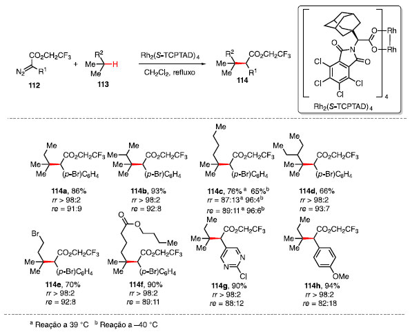 Davies e colaboradores exploraram a alquilação de ligações C-H terciárias catalisada pelo complexo quiral de dirródio Rh2(S-TCPTAD)4 utilizando diazocompostos 112 como fonte de carbeno e três equivalentes de substrato 113, fornecendo o produto alquilado 114 em bom rendimento e enantiosseletividade (Esquema 22).43