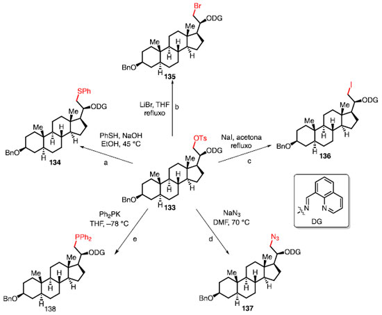 FORMAÇÃO DE LIGAÇÕES C-O A funcionalização de ligação C-H em estágio avançado para formação de ligação C-O é muito utilizada como um caminho para chegar em outras ligações.2,3,5,22,47 A capacidade de derivatizar um composto contendo a ligação C-O pode ser exemplificado pelo esquema 28, onde ocorre a conversão de um análogo de esteroide 133 em outros compostos através de reações de substituição nucleofílica alifática. A substituição por um tiol (reação a), substituição por bromo (reação b), substituição por iodo (reação c), substituição por azida (reação d), e, bem como substituição por PPh2 (reação e), fornece os respectivos produtos 134-138.47