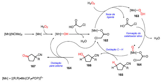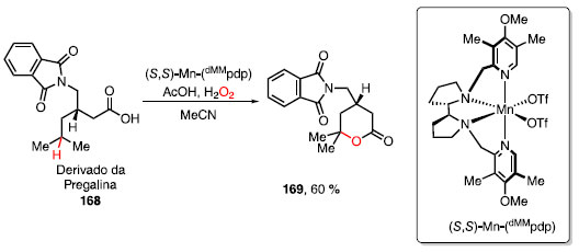 Uma nova troca de ligantes ocorre com a adição de H2O2, formando o complexo 163 e liberando o ácido cloroacético, que retorna ao ciclo catalítico, fornecendo o catalisador ativo 164 e liberando água. O cálculos indicaram que o intermediário 164 pode ser tanto uma mistura do complexo como tripleto ou quinteto, isto é, se a ligação Mn-oxo estará como uma ligação simples (tripleto) ou como uma ligação dupla (quinteto). Com o catalisador ativo 164, ocorre a oxidação C-H do substrato 165 via formação do radical mais distante do grupo retirador de elétrons, fornecendo o álcool 166 e o complexo 162, completando o ciclo catalítico para o manganês. O álcool 166 sofre uma nova oxidação pelo catalisador ativo 164, produzindo a cetona 167, juntamente com os complexos [Mn]-OH ou 162, uma vez que os cálculos mostraram que ambos os caminhos para obter os dois complexos são favoráveis. Em 2017, Bietti, Costas e colaboradores utilizaram o catalisador a base de manganês, (S,S)-Mn-(dMMpdp) para a oxidação de ligações C-H. Essa abordagem foi possível para a conversão de uma molécula bioativa derivada da pregabalina (168) e possibilitando a formação a lactona 169 em rendimento de 60% (Esquema 34).54