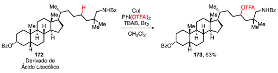 Essa estratégia foi passível de ser utilizada na trifluoroacetoxilação do derivado do ácido litocólico (172) e o composto 173 foi obtido seletivamente em 63% de rendimento (Esquema 36).55