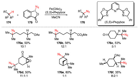 Essa metodologia pôde ser aplicada na modificação de produtos naturais e a reação de azidação catalisada por manganês levou à formação do composto 189, um produto de funcionalização na posição C2 do esclareolídeo (32), com 57% de rendimento e uma razão a:fi de 7,5:1. Esse método também foi eficiente para moléculas frágeis como a artemisinina (12), com a azidação exclusiva na posição C10 como produto 190 em 20% de rendimento (Esquema 41).61