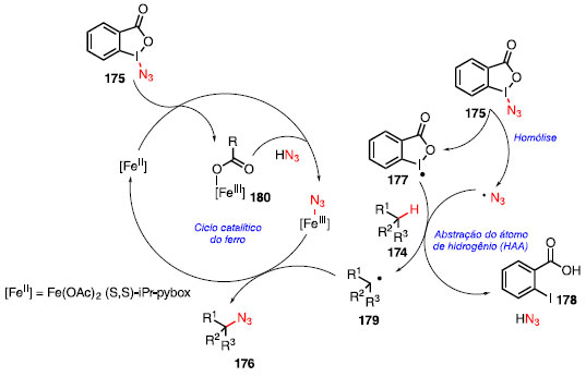A reação de azidação foi seletiva para ligação C-H terciária mais rica em elétrons, resultando em rendimento moderado para o isômero isolado, como em 176a e 176b. Para ambos os exemplos a seletividade favoreceu a ligação C-H mais distante do retirador de elétrons. Tal reatividade também foi observada em compostos cíclicos 176c e a oxidação ocorreu na ligação C-H terciária mais rica eletronicamente, e com uma seletividade maior para a ligação C-H mais distante da cetona, fornecendo o produto em 53% de rendimento. Esse método também se mostrou tolerante à presença de epóxidos e anéis de quatro membros 176d e 176e, também com rendimentos de moderados a bons. Para o produto 176d, a reação foi bastante seletiva, funcionalizando a ligação C-H do grupo isopropila. Para o produto 176e, mesmo com o alto rendimento, não foi seletiva a ponto de o produto não apresentar excesso diastereoisomérico. Em casos em que as ligações C-H eram eletronicamente similares, como 176f, apesar de ser menos acessível estericamente, a flexibilidade conformacional do grupo isopropila promove a azidação seletiva da ligação C-H da mesma.58 O mecanismo da reação, proposto pelo grupo de pesquisas de Hartwig em uma publicação recente,59 mostra que ocorre primeiramente a quebra homolítica da ligação I-N do composto 175, formando os radicais 177 e »N3, e ambos são responsáveis pela abstração do átomo de hidrogênio (do inglês hydrogem atom abstraction, HAA), formando o ácido carboxílico 178, HN3 e o intermediário radicalar 179. No ciclo catalítico do ferro, o [Fen] reage com o 175, podendo formar diretamente o complexo [Fe111]-N3 ou o complexo 180, nesse caso ocorrendo a troca de ligante com HN3, convergindo ao mesmo complexo [FeIn]-N3. Este complexo é o responsável por reagir com o radical 179, fornecendo o produto 176 e o complexo [Fe11], completando o ciclo catalítico (Esquema 38).