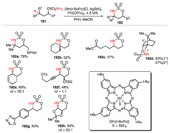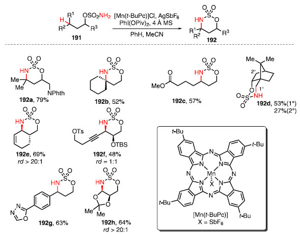 Em 2015, White e colaboradores reportaram uma metodologia de formação de ligações C-N de maneira intramolecular a partir de ligações C-H. Nesse trabalho foram utilizados o catalisador a base de manganês, o [Mn(t-BuPc)], um sal de aril iodônio levando à conversão de ésteres sulfâmicos 191 nos produtos 192 (Esquema 42).62