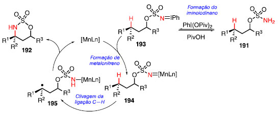 A condição reacional desenvolvida possibilitou a funcionalização de ligações C-H primárias, secundárias e terciárias, além de tolerar diversos grupos funcionais, como ftalimidas 192a. Essa técnica mostrou-se efetiva para a formação de azaespirociclo 192b. O catalisador é sensível a efeitos eletrônicos dos substratos, e o composto 192c pôde ser obtido em 57% de rendimento. Grupos retiradores de elétrons mais próximo ao éster sulfâmico reduzem a reatividade. Observou-se também a funcionalização preferencial de posições g formando um anel de seis membros frente a posições b que formam anéis de cinco membros, como observado no composto 192d. Essa metodologia mostrou-se altamente diasteroseletiva para o ciclo-hexeno 192e. O composto 192f foi formado com rendimentos moderados, mostrando que a técnica é tolerante à presença de alcinos. A obtenção do composto 192g mostra que essa metodologia também é tolerante a heterociclos aromáticos como o oxadiazol. Já o composto 192h foi obtido com bom rendimento e seletividade. O mecanismo da reação proposto consiste na formação de imi-noiodinano 193 a partir do éster sulfâmico 191, e o intermediário formado reage com o complexo [MnLn] para a formação do meta-lonitreno 194. O nitreno formado é responsável pela clivagem da ligação C-H, formando o radical 195, que rapidamente se recom-bina, fornecendo o produto 192 e o catalisador [MnLn], restaurando o ciclo catalítico (Esquema 43).62 A etapa da recombinação é rápida a ponto de que essa transformação apresenta estereorretenção, isto é, sem que ocorra a racemização/epimerização do produto, como normalmente ocorre em transformações clássicas envolvendo formação de radical.