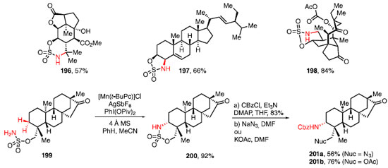 O derivado da pleuromutilina forneceu o composto 198 em 84% de rendimento como um único isômero, frente a outros sítios possíveis de funcionalização. O derivado do isoesteviol 199 forneceu o composto 200 em 92% de rendimento formando apenas o diasteroisômero syn. O produto 200 pôde ser facilmente diversificado para formar os compostos 201a e 201b.62 Em 2019, Dauban e colaboradores utilizaram catalisadores a base de ródio [Rh2(CF3CONH)4] e [Rh2(esp)4] para realizar reações de aminação em estágio avançado de ligações C-H utilizando também ésteres sulfâmicos e reagente de iodo hipervalente como oxidante (Esquema 45).63 Algo que chama a atenção é a estrutura ao redor do centro bimetálico do catalisador, lembrando uma "roda de pá" (do inglês paddlewhell).