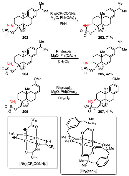 Aplicando a derivados de produtos naturais contendo esqueletos abietanos, a aminação intramolecular dos compostos 202, 204 e 206 resultaram na obtenção dos produtos 203, 205 e 207, respectivamente, como um único estereoisômero. É notório a tolerância dessa metodologia frente a outros grupos funcionais, como uma olefina conjugada ao anel aromático, em 204, e de anel mais rico em elétrons, como em 206.63