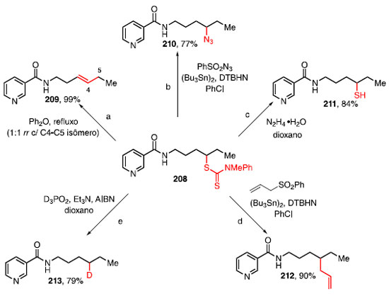 FORMAÇÃO DE LIGAÇÃO C-S A ligação C-S apresenta versatilidade para a química orgânica, uma vez que compostos contendo enxofre podem servir de trampolim para a instalação de outras funcionalidades.64,65 Essa versatilidade é evidenciada pela conversão de um único ditiocarbamato derivado da nicotinamida 208 em outros compostos através de reações bem estabelecidas como, por exemplo, eliminação tipo-Chugaev, transferência de azida, remoção do grupo ditiocarbamato, reações radicalares de alilação e deuteração, para obter os respectivos produtos 209-213 (Esquema 46).64