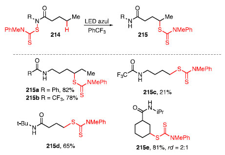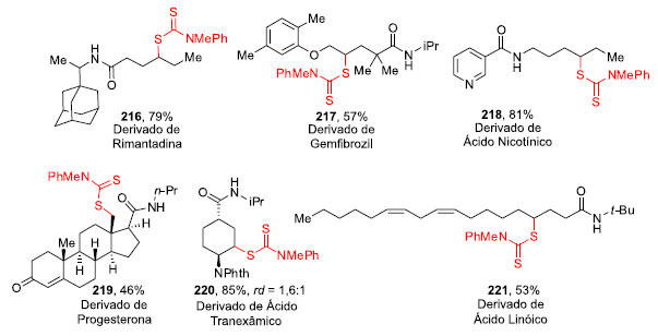 A formação inicial do ditiocarbamato acontece através do acoplamento do ácido carboxílico com uma amina (via formação do cloreto de ácido) obtendo a amida 214 que, então sofre irradiação de luz azul LED em PhCF3 para a funcionalização da ligação C-H, fornecendo o produto ditiocarbamilado 215.65 A ditiocarbamilação não se limitou à inserção em ligações C-H metilênicas como em 215a e 215b, e a funcionalização em ligações C-H metílicas também foi bem sucedida como demonstrado pela obtenção de 215c e 215d. Por fim, substratos cíclicos também se mostraram compatíveis com essa transformação e o composto 215e foi obtido em 81% de rendimento.64 Produtos naturais e fármacos também foram funcionalizados a partir dessa abordagem (Figura 2). A rimantadina, um agente antiviral que inibe especificamente a replicação do vírus influenza tipo A,67 forneceu o produto 216 com 79% de rendimento. O gemfibrozil, utilizado no tratamento de hiperlipidemias, que são alterações metabólicas que ocorrem quando níveis de lipídeos estão altos na corrente sanguínea,68 possibilitou a realização do produto 217 com 57% de rendimento.