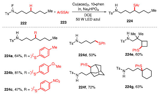 O ácido nicotínico, uma vitamina com propriedades hipolipemian-tes, que reduz os níveis de triglicérides e LDL colesterol (lipoproteína de baixa densidade), ambas gorduras armazenadas no corpo, e aumenta o nível de HDL colesterol, uma lipoproteína de alta densidade,69 gerou o ditiocarbamato 218 com 81% de rendimento. Já a progesterona, que é um hormônio esteroide natural, produzido pelo corpo lúteo ovariano após a ovulação e pela placenta durante a gestação,70 foi funcionalizada e o produto 219 foi obtido em 46% de rendimento. O ácido tranexâmico, um fármaco antifibrinolítico, que previne a dissolução do coágulo, levando à redução da perda sanguínea,71 forneceu o produto 220 em bons rendimentos. O ácido linóico, um ácido graxo essencial na dieta humana, sendo o componente principal de muitas gorduras presentes nos alimentos incluindo os óleos extraídos de sementes de soja, milho e girassol,72 foi funcionalizado em 53% de rendimento gerando o composto 221. Uma outra abordagem para a instalação de ligações C-S a partir de ligações C-H via HLF foi descrita por Yang e colaboradores em 2020 (Esquema 48).66 A reação entre N-fluorotosil amida 222 e arildissulfeto 223, catalisada por cobre, 10-phen como ligante, Na2HPO4 como base e índio como aditivo, sob irradiação de luz LED azul, forneceu os compostos 224.