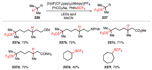 O acetato de androsterona e o 5a-androstanediona são derivados do núcleo dos esteroides androstano e forneceram os produtos de xantilação 233 e 234 com 56% e 44% de rendimento, respectivamente. Por fim, o 5a-colestano, um derivado do núcleo dos esteroides colesterol, foi funcionalizado levando à formação do produto 235 com 60% de rendimento.64 Em 2016, Glorius e colaboradores desenvolveram um método para a instalação de um grupo trifluorometilsulfanil em um grande número de ligações C-H. O tratamento de compostos 236 com PhthSCF3, como o reagente de inserção do grupo SCF3, um fotoca-talisador de irídio, benzoato de sódio, como aditivo, em acetonitrila, sob irradiação de luz azul, forneceu os produtos 237 (Esquema 51).74
