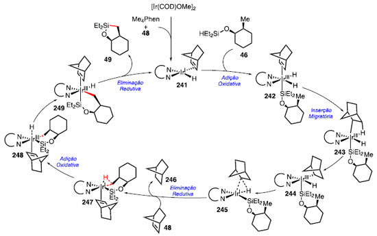 O tratamento de sililéteres 46, com a utilização do catalisador [Ir(COD)OMe]2, Me4Phen como aditivo e norborneno (48), como aceptor de H2 em THF leva à formação do intermediário 49. Em seguida, a oxidação do composto 49 com TBHP, CsOH»H2O e TBAF em DMF, forneceu o 1,3-diol 50.26,79 Álcoois cíclicos terciários sofrem a funcionalização em ligações C-H secundárias, podendo fornecer uma mistura de isômeros como em 50a e 50b, em 46% e 29% de rendimento, respectivamente. O efeito estéreo de grupos presentes no substrato tem grande influência na sítiosseletividade da reação de sililação, e o grupo volumoso t-butil na cadeia lateral do ciclo-hexano dirige a reação para a ligação C-H axial, fornecendo 50c em 76% de rendimento como único isômero. A presença de um grupo fenila em posição equatorial em 50d faz com que a funcionalização ocorresse na cadeia lateral, fornecendo o diol em 76% como único isômero. A presença de um substituinte cíclico lateral 50e, ou de grupos funcionais oxigenados em 50f e 50g não impedem o prosseguimento da reação, gerando os produtos em 18%, 56% e 62%, respectivamente. O mecanismo da reação de sililação de ligações C-H foi proposto por Sunoj e colaboradores a partir de cálculos computacionais (Esquema 53).80 O pré-catalisador [Ir(COD)OMe]2, na presença do ligante Me4Phen e norborneno (48), é convertido no catalisador ativo 241, seguido da adição oxidativa da ligação Si-H, obtendo-se o intermediário 242, que sofre então inserção migratória do norborneno coordenado, formando o complexo 243. Com a transferência do próton ligado ao átomo de irídio para o norborneno, tem-se a formação do intermediário 244, seguido da conversão para o composto 245, em que há a interação agóstica entre a ligação C-H do norborneno e o centro metálico.