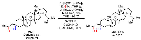 A primeira etapa da eliminação redutiva é impulsionada por 48, fornecendo o complexo 247 e norbornano (246). A partir de 247, ocorre a adição oxidativa da ligação C-H, gerando o intermediário 248 que, após a conversão para o correspondente 249, sofre eliminação redutiva, fornecendo o produto 49 e o catalisador 241. Segundo os cálculos computacionais, a etapa de eliminação redutiva para a formação da ligação C-Si é a etapa determinante, com o maior valor de energia do estado de transição.80 O colesterol é um dos principais esteroides sintetizados pelos animais, auxiliando no funcionamento de suas células, além de ser precursor de diferentes hormônios esteróides e de vitaminas. O protocolo de sililação de ligação C-H seguida por oxidação pôde ser aplicado na funcionalização do derivado do colesterol 250, levando à formação do composto 251 em 68% de rendimento para três etapas (Esquema 54).81