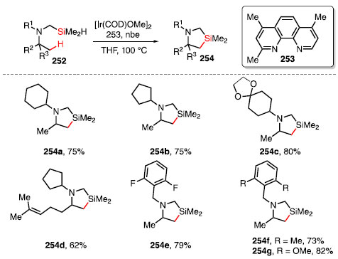 Hartwig e colaboradores puderam estender a metodologia para a sililação seletiva de ligações C-H em posição b a aminas alifáticas, catalisadas por irídio, utilizando a fenantrolina 253 como ligante, nas condições semelhantes às utilizadas no protocolo estabelecido no trabalho anterior (Esquema 55).82 Os substratos utilizados 252 foram sililmetilaminas, as quais formam produtos cíclicos de cinco membros 254 que posteriormente puderam ser oxidadas para formar ligações C-O.