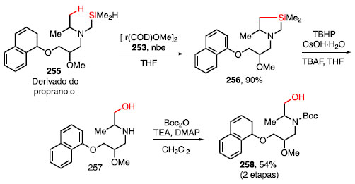 A funcionalização ocorre de forma seletiva em aminas que possuem ciclos ligados diretamente ao nitrogênio, fornecendo os produtos 254a e 254b em bom rendimento. Substratos com grupos funcionais como cetais 254c, olefinas 254d, haleto de arila 254e e grupos doadores de elétrons em posição orto 254f, 254g se mostraram tolerantes às condições reacionais empregadas, apresentando bons rendimentos.82 O derivado do propranolol 255, um dos 200 fármacos mais prescritos nos Estados Unidos em 2016 por conta de seu tratamento contra a ansiedade,83 foi submetido à sililação de sua ligação C-H b ao nitrogênio, fornecendo o produto 256 em 90% de rendimento. Após oxidação nas condições de Tamao-Fleming seguida de proteção com o grupo Boc, o produto 258 foi obtido em 54% de rendimento para 2 etapas (Esquema 56).
