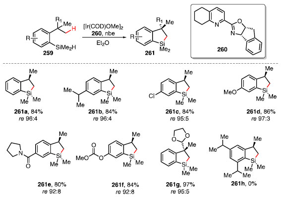 O grupo de pesquisas de Hartwig desenvolveu uma reação de sililação intramolecular enantiosseletiva através da funcionalização de ligações C-H metílicas de substratos 259, utilizando [Ir(COD) OMe]2, ligante quiral 260 e nbe, levando à formação dos produtos 261 (Esquema 57).84
