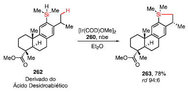 Essa metodologia permite a formação da ligação C-Si a partir da reação de dessimetrização enantioseletiva das metilas de um grupo isopropil para formar um centro de quiralidade em um anel de cinco membros.85 Os estudos mostraram que produtos provenientes de substratos não substituídos 261a, substituintes alquila 261b, e haletos de arila 261c são obtidos com bons rendimentos e razões enantioméricas. Substratos que possuem grupos funcionais com oxigênio ou nitrogênio, como alcóxi 261d, amida 261e, carbonato 261f e cetal 261g se monstraram toleráveis ao sistema reacional. Em geral, a metodologia é tolerante a diversos grupos funcionais, com a capacidade de gerar centros de quiralidade quarternários. No entanto, a reação não ocorreu em substratos contendo grupos volumosos em posições meta e orto, como visto em 261h.84 A metodologia foi aplicada no derivado do ácido desidroabiético 262, um diterpeno com propriedades antivirais, antitumorais e atividade citotóxica,86 levando à formação do composto 263 com 78% de rendimento e razão diastereoisomérica de 96:4 (Esquema 58).