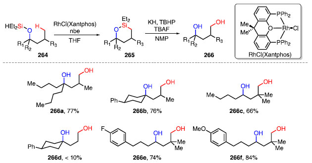 Hartwig e colaboradores também conseguiram executar a sililação intramolecular de ligações C-H primárias em posição S a álcooisterciários 264, quando catalisadas pelo RhCl(Xantphos) e nbe em THF, obtendo os intermediários 265 (Esquema 59). Após uma oxidação de Tamao-Fleming os 1,4-dióis 266 são obtidos.87
