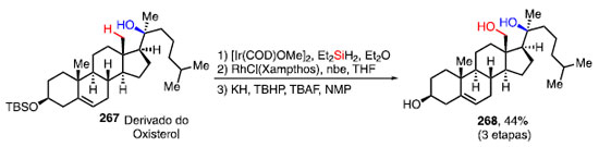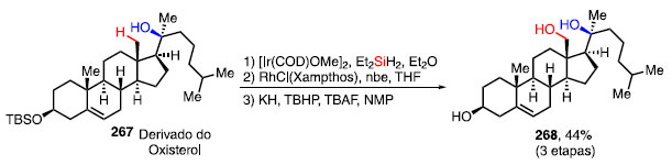Álcoois terciários contendo o grupo isobutil ou o ciclo-hexano são seletivamente funcionalizados e a ligação C-H primária são sililadas para fornecer os produtos 266a e 266b. A metodologia mostrou-se compatível inclusive com a funcionalização de ligações C-H em posição neopentílica e o produto 266c foi obtido em 66% de rendimento. Na ausência de ramificações na cadeia lateral, a reação não forneceu quantidade considerável do produto arilado 266d. Grupos funcionais como haleto de arila 266e e um grupo metoxiarila 266f se mostraram compatíveis com a reação, fornecendo os produtos em 74% e 84% de rendimento, respectivamente.87 A transformação em estágio avançado do derivado do oxisterol (267), uma molécula que atua como sinalizador por ter importância fisiológica, como o transporte de lipídeos,88 se mostrou eficaz e o produto 268 foi obtido em 44% de rendimento após três etapas (Esquema 60).