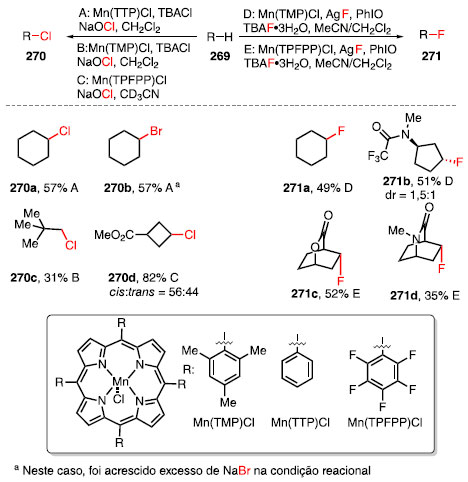 A metodologia forneceu os produtos clorados e bromados 270a e 270b em rendimentos moderados, via procedimento A, assim como a cloração de neo-pentano, fornecendo 270c em 31%, via procedimento B. Ao utilizar o catalisador Mn(TPFPP)Cl, deficiente em elétrons, substratos contendo grupos retiradores de elétrons puderam ser funcionalizados, como o éster 270d, em 82% de rendimento via procedimento C. Utilizando o procedimento D, os compostos 271a e 271b foram obtidos em rendimentos moderados, com a relação diastereoisomérica de 1,5:1 para o produto 271b, com o produto contendo a relação dos substituintes 1,3-anti favorecida. Ao utilizar o procedimento E, biciclos contendo lactonas e lactamas puderam ser funcionalizadas, fornecendo 271c e 271d em 52% e 35% de rendimento, respectivamente, como isômeros exclusivos. Essa metodologia foi aplicada na funcionalização do esclareolídeo (32) (Esquema 62). Nesse estudo, foram realizadas tanto a cloração quanto a fluoração, fornecendo os compostos 272 e 273 em 42% de rendimento para ambos os casos, com a funcionalização preferencial na posição C2. Para a cloração C-H, o material de partida recuperado foi reagido em mais dois ciclos, fornecendo o produto 272.