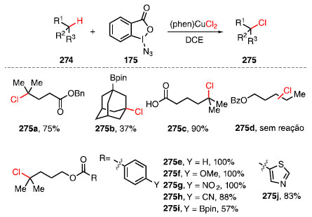 Em 2021, Hartwig e colaboradores reportaram uma reação de cloração radicalar, na presença do reagente 175 para gerar o o-iodobenzoiloxi radical, que é seletivo para a abstração do átomo de hidrogênio, e o complexo (phen)CuCl2, que entrega o átomo de cloro ao radical. Essa condição permitiu a conversão de uma ligação C-H terciária de compostos 274 ao correspondente produto clorado 275 (Esquema 63).92