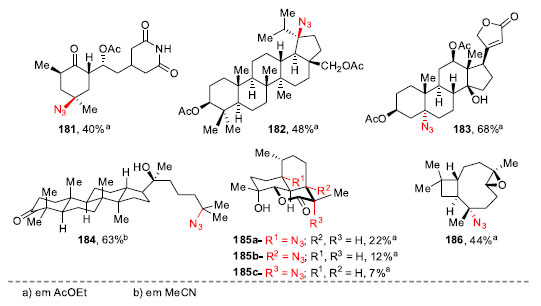 A seletividade observada por esse sistema permitiu com que a metodologia fosse aplicada na funcionalização em estágio tardio de produtos naturais. A azidação da ciclo-heximida, uma molécula de alta toxicidade, permitiu a obtenção exclusiva de 181 em 40 % de rendimento (Figura 1). O análogo do ácido betulínico, um triterpenóide contendo um sistema trans-decalina A/B, forneceu o produto 182 em um bom rendimento, considerando a complexidade da molécula.