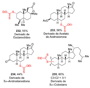 A funcionalização de substratos contendo grupos retiradores de elétrons forneceu os compostos 231a-231c em bons rendimentos, com preferência para a xantilação na posição ô em relação à posição g, indicando uma preferência para metilenos mais ricos em elétrons. Logo, para 231a, a seletividade em 64% é a obtenção do produto xantilado na posição ô, indicado em negrito, e 36% é a soma dos produtos de funcionalização de outras posições na mesma molécula. Para 231b e 231c, o mesmo raciocínio se aplica, cujo produtos apresentam uma seletividade em 58% e 55% frente aos subprodutos, respectivamente. Reações com cicloalcanos forneceram produtos com bons rendimentos, como é possível ver com o produto 231d. A xantilação de norbornano forneceu o produto 231e em 49% de rendimento como o único diastereoisômero. A funcionalização do adamantano favoreceu a ligação C-H de carbono terciário, fornecendo como único produto o xantato 231f com rendimento de 70%. Exemplos de xantilação de moléculas complexas derivadas de produtos naturais são mostrados na Figura 3. A funcionalização do esclareolídeo possibilitou a formação do produto 232 com 55% de rendimento de forma seletiva.73